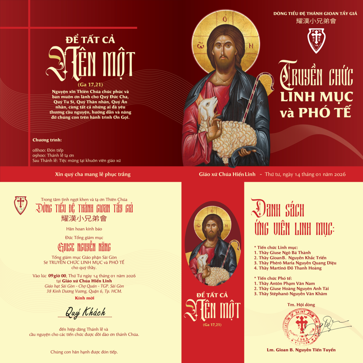 Hội Dòng Tiểu Đệ Thánh Gioan Tẩy Giả xin thông báo về Thánh Lễ Truyền Chức Phó Tế và Linh Mục,